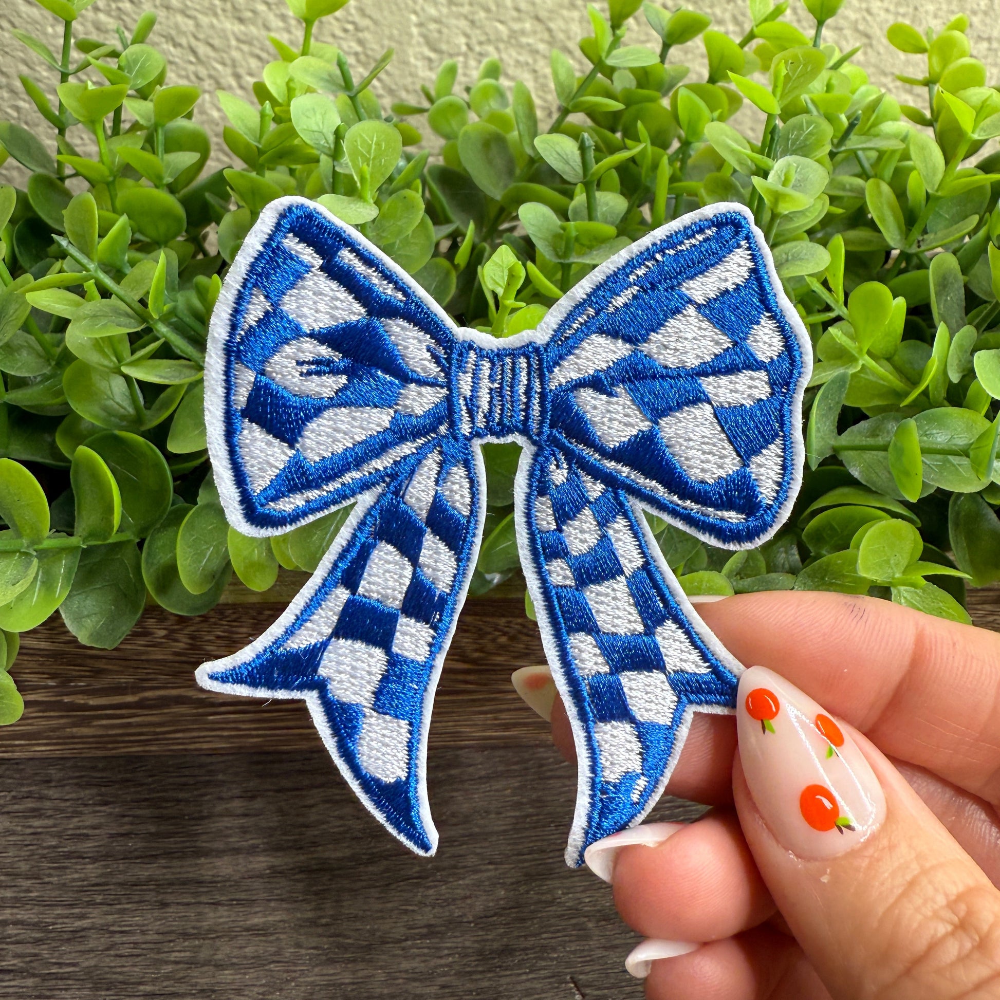 Blue and White Checkered Bow Embroidered Hat Patches