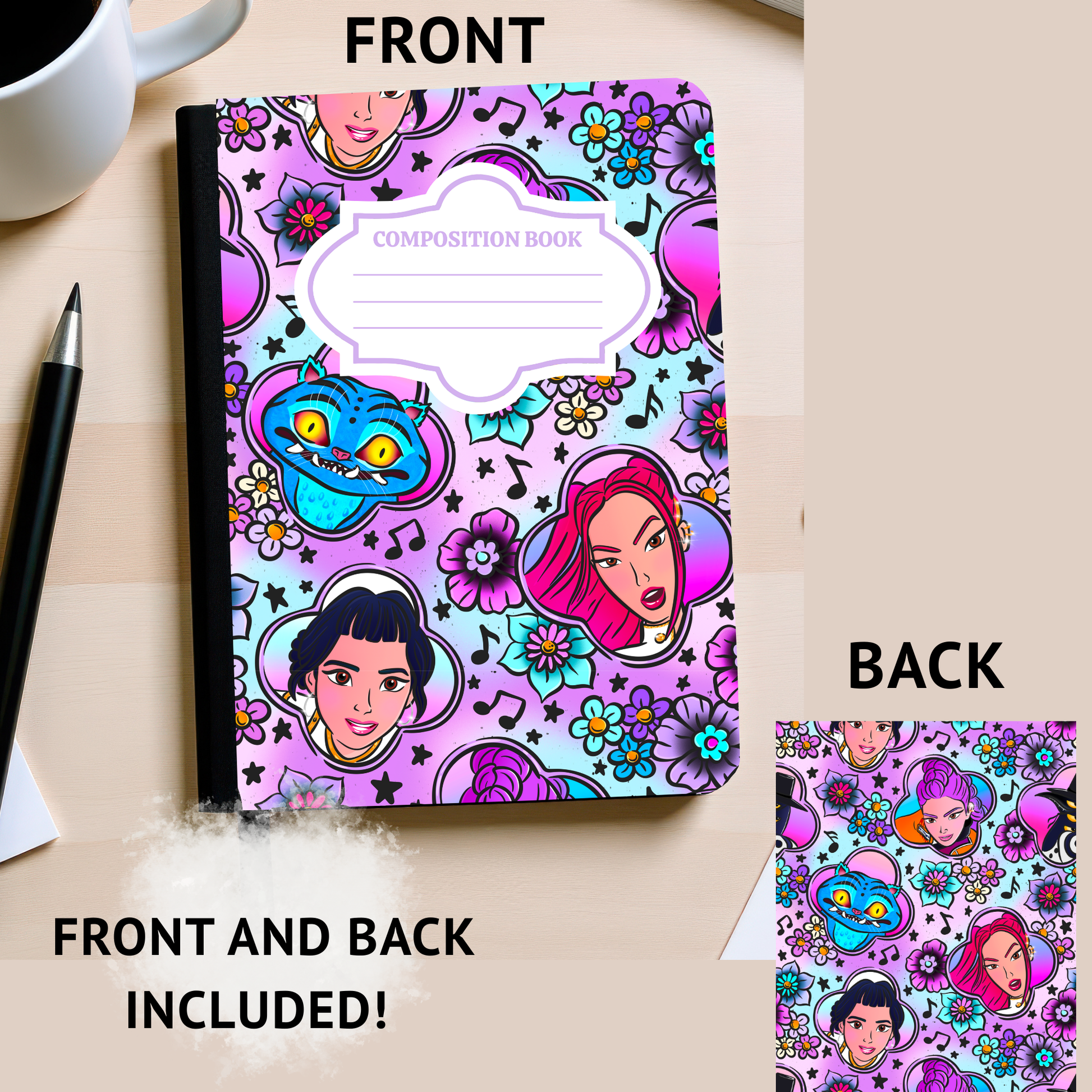 Printed slightly bigger than the cover/back of the composition book so that you can wrap the vinyl around OR cut